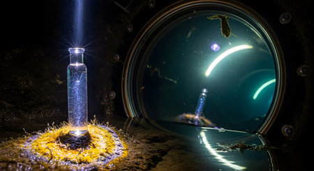 In a dark, underwater environment, a mysterious glass vial containing a glowing liquid rests on the seabed. A single beam of light from above illuminates the vial, causing it to sparkle. The scene, possibly viewed from a submarine porthole, evokes a sense of scientific discovery, mystery, and science fiction.