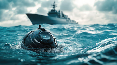 A close-up of an autonomous underwater vehicle navigating the ocean, with a navy ship visible in the background, symbolizing advanced maritime security operations