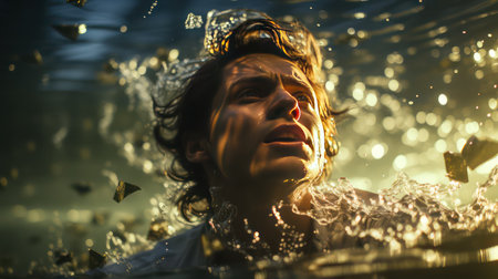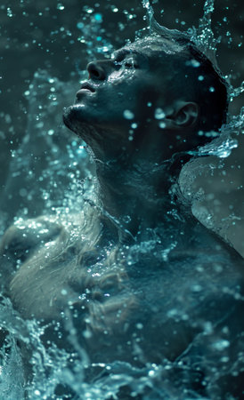 Portrait of a man surrounded by a tranquil splash of water in a dimly lit setting
