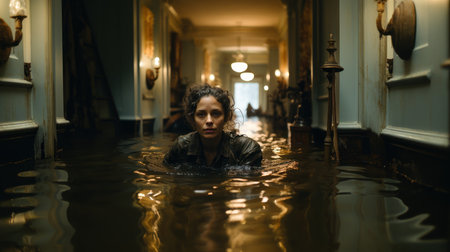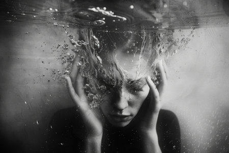 A mesmerizing underwater shot revealing a face surrounded by liquid, creating an ethereal atmosphere. The interplay of light and water enhances the emotional depth.