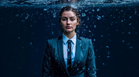 concept pressure in society to perform, women in male positions, abstract portrait of young attractive business woman in suit submerged in water