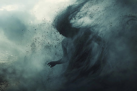 A figure dissolves into a powerful tornado, merging with swirling dust and debris. The atmosphere is heavy with tension, highlighting the raw force of nature's chaotic beauty.