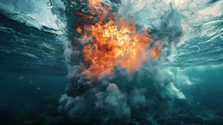 An open hand reaches upward through vibrant, flowing water, creating a dynamic visual. The composition features rich blues and oranges, enhanced by overhead sunlight that filters through the liquid. The textured appearance suggests a deep aquatic environment, suitable for various editorial and commercial applications. The image evokes a sense of freedom and exploration.