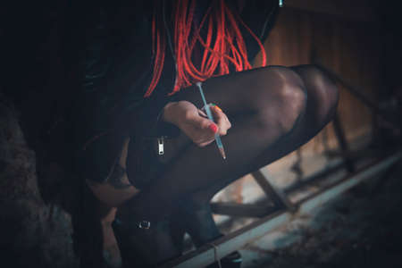 Girl addict in a leather jacket with a dose in a syringe prostitute. drug addict prostitute young woman with heroin syringe. Drug addiction and prostitution are crimes of the poor.