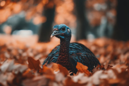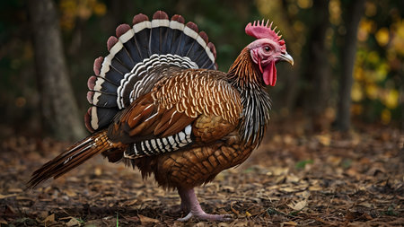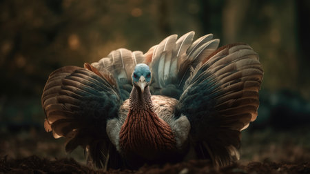Turkey on a blurred background. Place for text, banner with bird, traditionally American bird for Thanksgiving day, symbol of festive feast. Generative AI