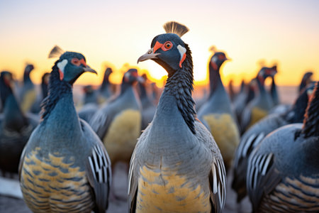 group of turkeys on a farm in the evening light. selective focus