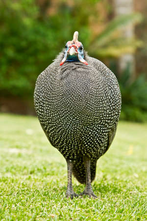 Helmeted guineafowl, guineahen walking on the lawn.