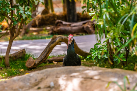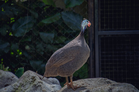 Helmeted guineafowl (Numida meleagris) bird standing on a rock inside a zoo enclosure in Malaysia. The bird has a speckled body with a bare bluish head and red wattle. Captured in natural light with green foliage in the background.