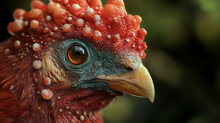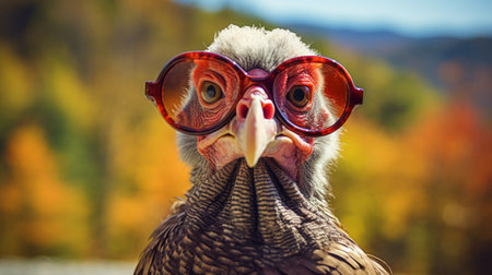 a turkey wearing sunglasses stands outdoors, exuding a rural american vibe. the eye-catching composition captures the essence of futuristic optics in wildlife photography. this unique image combines elements of kombuchapunk, with its light amber and crimson hues, creating a captivating and distinct grandparentcore aesthetic. ai generated