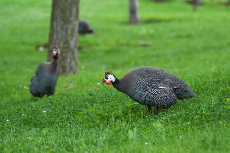 Guinea fowl birds on the grass in the park. Close-up.