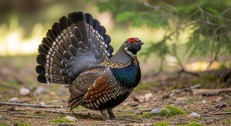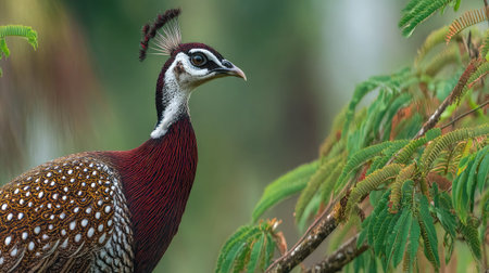 A striking bird with burgundy feathers, spotted wings, and a distinctive white and black head. The image displays the bird in a natural setting, close to green foliage. The composition showcases a soft, out-of-focus background, suggesting outdoor environment. Ideal for illustrative content or design projects.