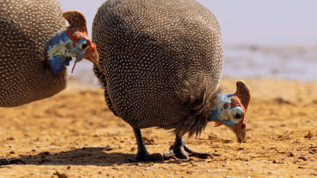 Helmeted guineafowl Numida meleagris reichnowi foraging for food.