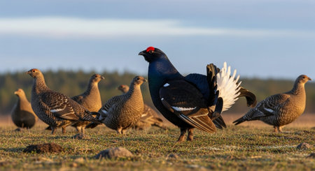 A flock of majestic turkeys standing gracefully on a lush green field.