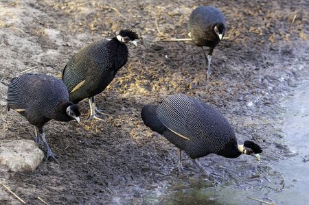 A group of Crested Guinea Fowl near water