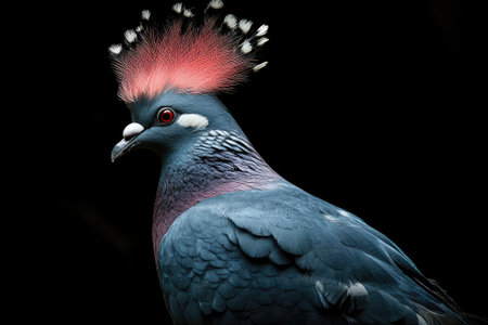 Victoria crowned pigeon is posing in front of a black background showing its beautiful blue feathers and red eye