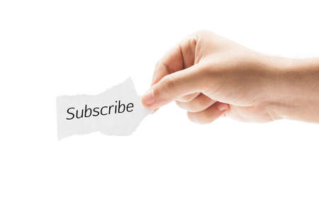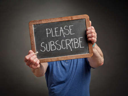 please subscribe, slate blackboard sign in chalk held by a man, social media and communication concept