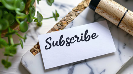 Wooden dice with the word Subscribe on it placed on wooden desk next to a blank paper or form and a pen.