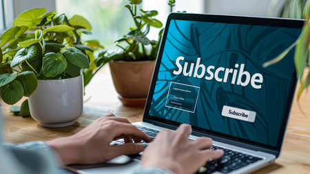 Subscribe button on laptop screen. Social media and digital marketing concept.