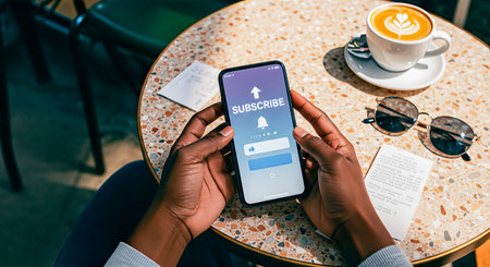 Woman with smartphone shows subscribe notification while seated at cafe table with coffee, sunglasses, and notes, highlighting social media interaction and lifestyle