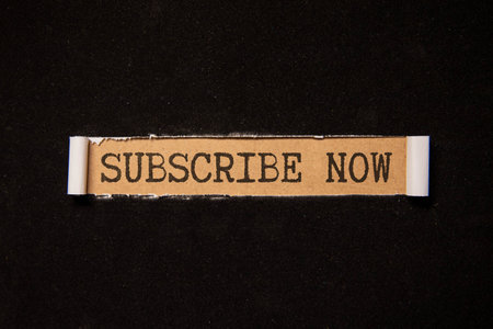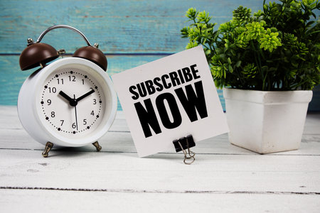 Subscribe Now text written on paper card with alarm clock on wooden background