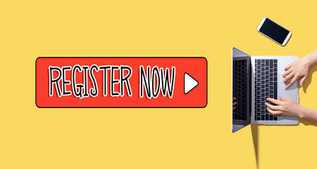 Subscribe now. Online video subscription red button. Internet service on laptop digital tablet blurred technology background. streaming video. communication network