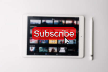 subscription service. Online video red subscribe button. Internet service on laptop digital tablet blurred technology background. streaming video. communication network