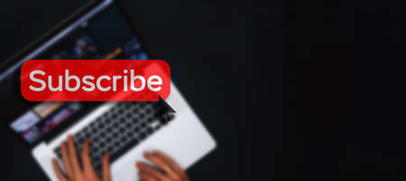 subscribe banner. Online video subscription red button. Internet service on laptop digital tablet blurred technology background. social media concept. Streaming video