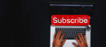 subscribe button. Online video subscription red button. Internet service on laptop digital tablet blurred banner background. Visual contents concept. social networking service