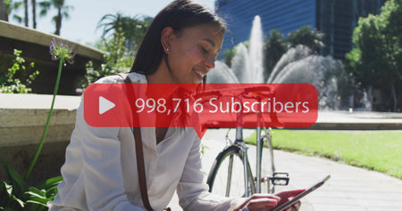 Play icon with increasing subscribers against woman using smartphone sitting in corporate park. social media networking and technology concept