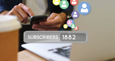 Close up of a businessman seated on a desk in front of a laptop and a cup of coffee while texting. Digital image of a subscriber count bar with icons flying upward is seen in the foreground