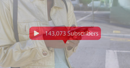 Image of subscribers text with growing number over caucasian man using smartphone. Social media, communication and digital interface concept digitally generated image.