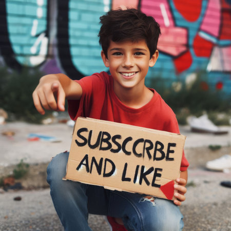 Young boy holding a placard with the inscription SUCCESS AND LIKE in front of a graffiti wall