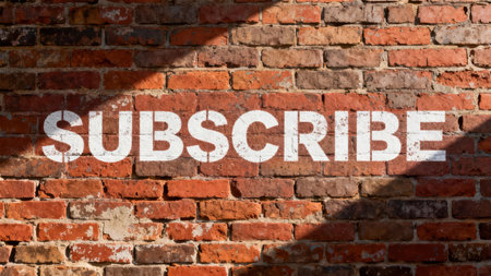 Close up of rough red, gray, and brown brick masonry facade showing cracks and weathered mortar, emphasized by the contrasting white stenciled 'SUBSCRIBE' call to action word.