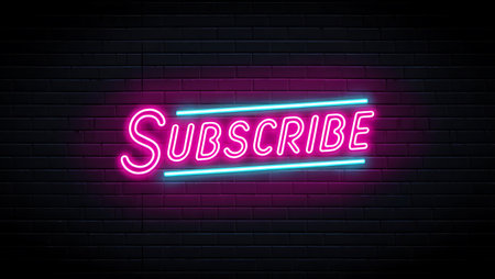 Subscribe neon sign on brick wall background. Vector illustration. Eps 10.