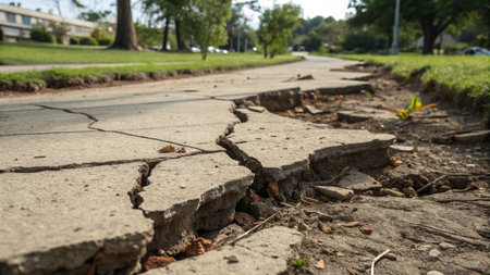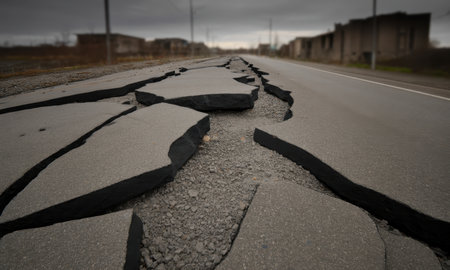 A stunning image of a cracked road surface resulting from earthquake damage, set against a backdrop of buildings and a vibrant blue sky.