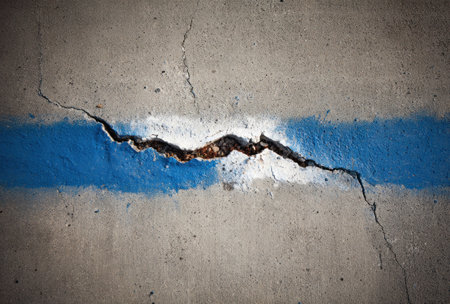 Close-up of cracked concrete surface with a faded blue stripe and white paint