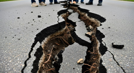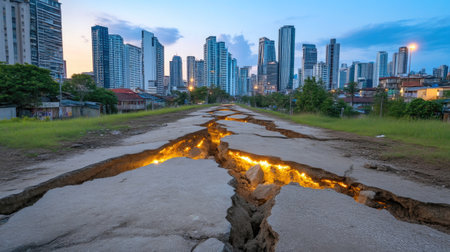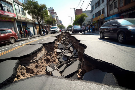 Urban Street Scene: Long Crack in Road Revealing Earthquake's Impact. AI