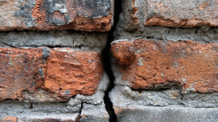 Cracked brick wall showing weathered texture and earthy tones, highlighting contrast between red and gray bricks. image evokes sense of age and resilience in construction materials