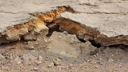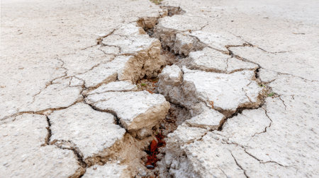 close-up of fault line, with visible cracks and tension, created with generative ai