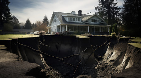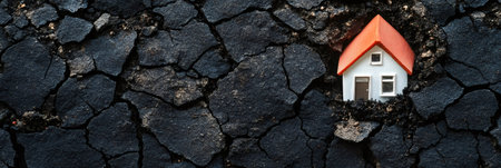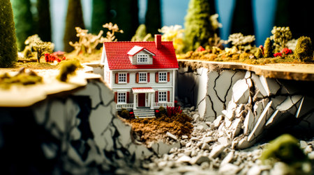 Miniature house sinking into cracked earth after earthquake, highlighting the devastating effects of natural disasters on homes and properties