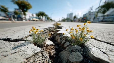 This captivating image shows resilient wildflowers emerging through a cracked urban street. The contrast between nature and concrete emphasizes beauty and survival in challenging environments.