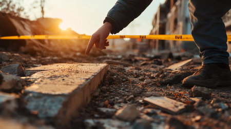 Geologist pointing at a fault line offset in a destroyed urban environment, indicating ground displacement caused by a seismic event, with caution tape and rubble in the background at sunset