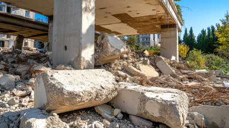 This image captures a scene of abandoned construction with scattered debris under a clear blue sky, highlighting the effects of urban decay and destruction.