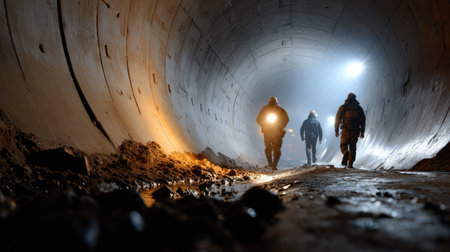 Three miners walk through a dimly lit tunnel, showcasing the challenges of underground work. They wear headlamps that illuminate their path, emphasizing safety and teamwork in a rugged environment.