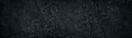 Black old shabby wall wide texture. Aged concrete surface with peeling paint. Dark long background