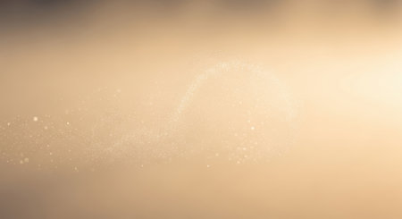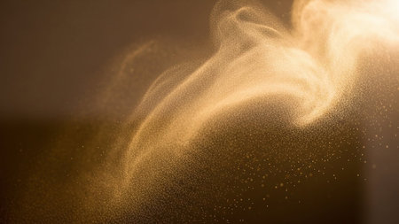 Swirling golden particles and dust motes illuminated by warm light create a dynamic and ethereal abstract...