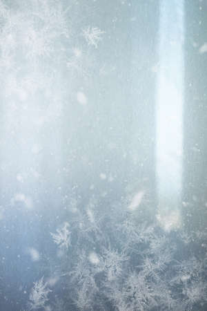 Frozen window. Snowflakes on the glass in winter. Frost on the glass of the window. Winter morning outside the window. Snowy frosty pattern on a glass surface. Background.