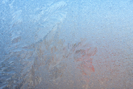 Winter ice pattern on the frozen window. Texture, background for inserting text. New Year theme. Winter. Cold.