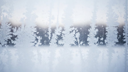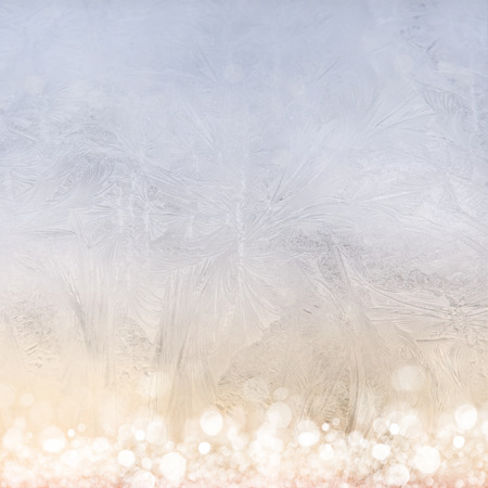 White Christmas background with a close-up of frosted window glass, ice patterns, and blurred winter scene outside