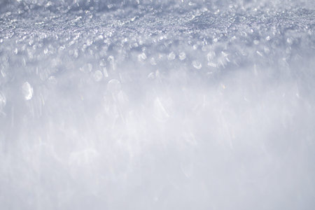 Close up macro photography texture of sparkling fresh white snow with light blue sky reflection tone. selective focus. winter christmas background.